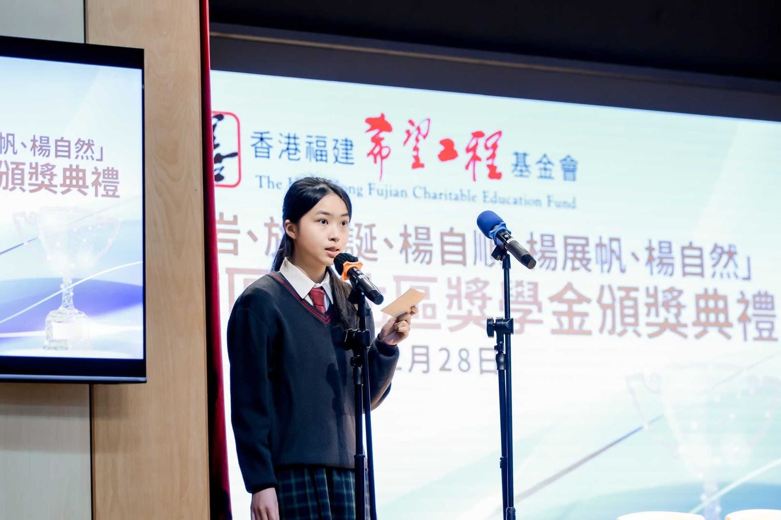 在參加頒獎典禮時,我的心情既激動又忐忑。激動的是有幸獲得香港福建希望工程基金會的獎學金,這份肯定讓我備受鼓舞;忐忑的是能作為得獎者代表發言,既感榮幸,也倍感壓力。所幸整個過程順利圓滿。
